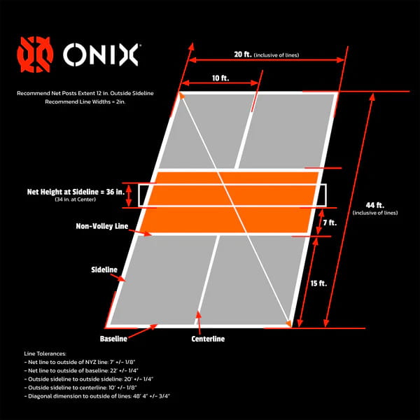 Một sân pickleball tiêu chuẩn có kích thước gần tương đương sân cầu lông đôi, với chiều dài 13.4112m (tính cả vạch kẻ) và chiều rộng 6.096m (tính cả vạch kẻ). Chiều cao lưới là 0.9144m ở hai bên và 0.8636m ở giữa. Đúng vậy, sân này khá giống với sân tennis. Sân được chia thành các ô giao bóng bên phải và bên trái, cùng với khu vực không vô-lê rộng 2.1336m phía trước lưới, thường được gọi là “kitchen” (khu bếp).